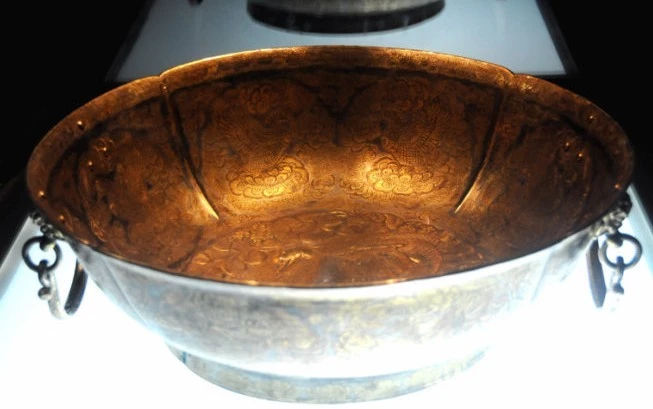 通高14.5厘米,口徑46.0厘米,足徑28.5厘米,足高2.5厘米,壁厚0.6厘米,總重6265厘米。澆鑄成型,紋飾鎏金。盆為葵瓣形侈口,圓唇,斜腹下收,有矮圈足。盆口有一圈蓮瓣紋,盆壁分四瓣,每瓣鏨兩個(gè)石榴團(tuán)花,團(tuán)花中有一只鴛鴦,還襯有流云和闊葉紋。盆腹內(nèi)外,花紋雷同。盆底有一對嬉戲鴛鴦為中心的石榴團(tuán)花淺浮雕。圈足微外撇,外飾二十四尕蓮花。