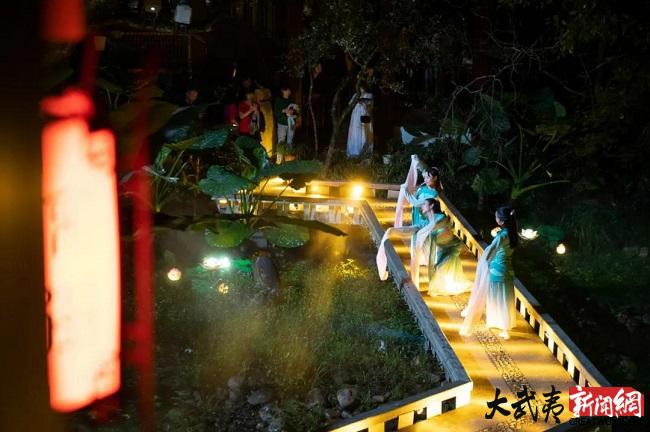 中秋之夜,月滿情濃。武夷山宋街景區(qū)內(nèi),流光溢彩,人流如織。吃茶、聽曲、猜燈謎......伴隨著古街內(nèi)的典雅的古琴聲“宋風(fēng)當(dāng)潮 · 武夷月夕”活動擺茶開席,歌舞秀+民俗表演,將歷史上武夷山中秋夜民間祭月的場景予以復(fù)原,讓現(xiàn)場游人穿越時(shí)空,感受傳統(tǒng)中秋的賞月民俗。